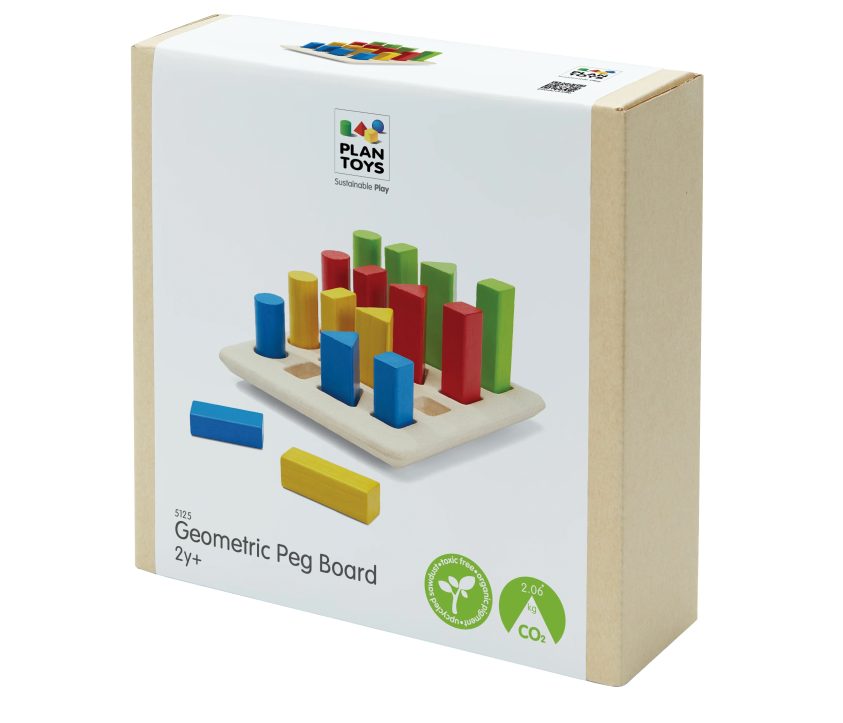 These 16 geometric pegs (4 different sizes, shapes, and colors) can be sorted, counted, and stacked on a sturdy PlanWood base to make for an educational play experience.